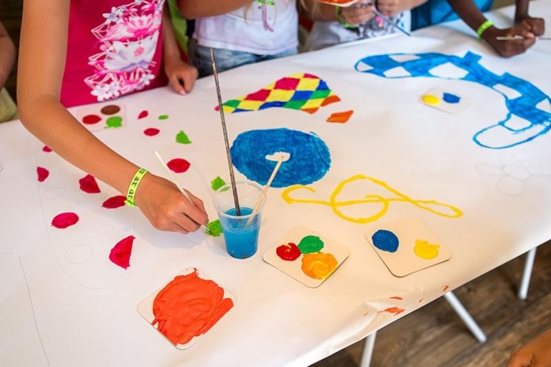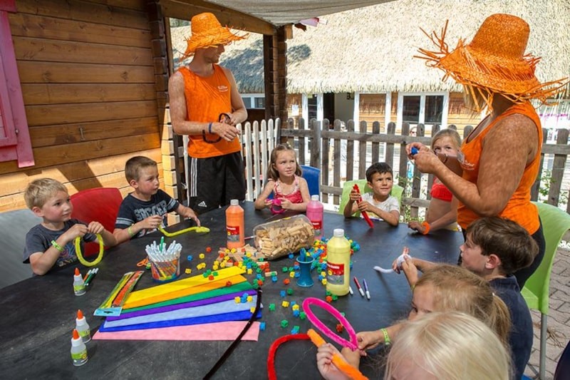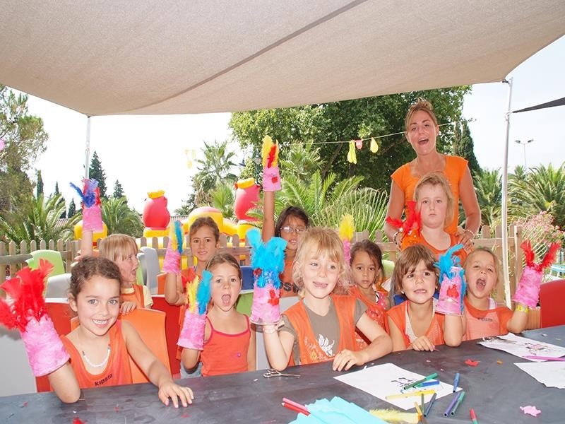 Twice a week they take part in the _children's party_ and the mini disco. They try out their first dance steps _like the grown-ups._ Entertainment programmes offer activities as diverse as collage, painting, creating pompoms ... a weekly party is organised, and they prepare a talent show in your honour. Their entertainment club is air-conditioned and they enjoy a large shaded terrace.