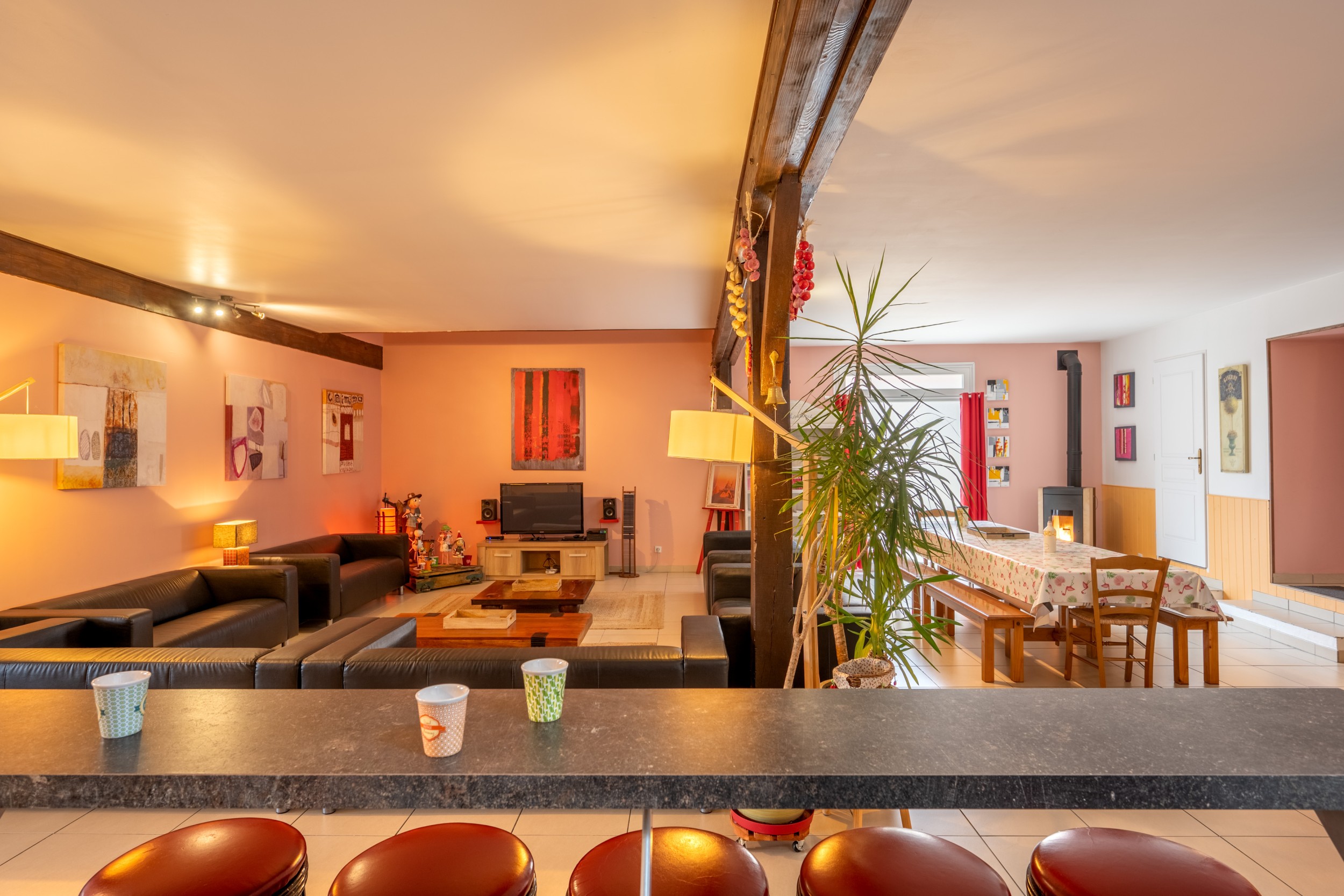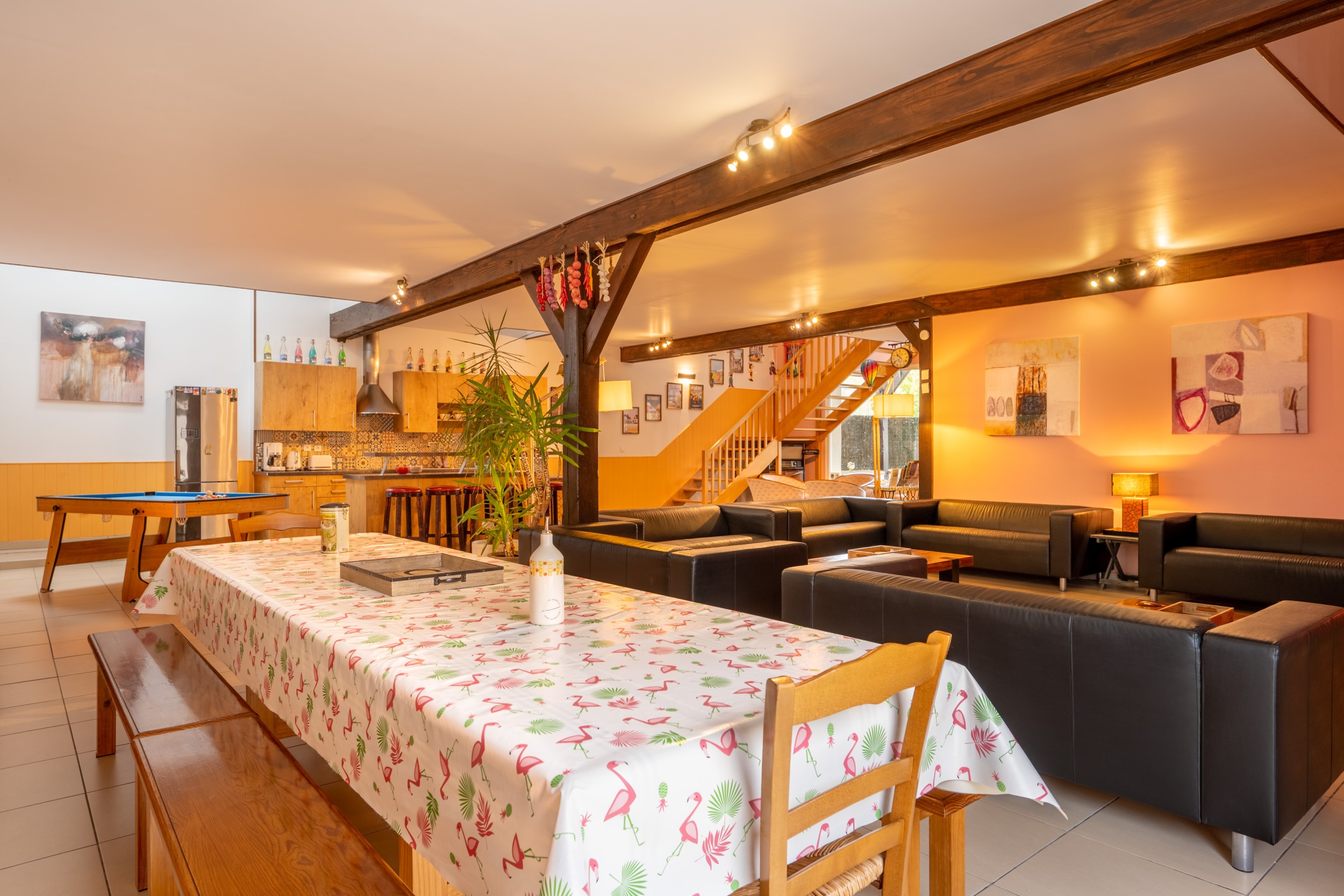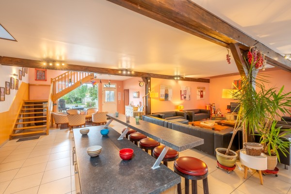 We've tried to take care of everything to ensure that your day is a success : swimming, bed linen and towels are included in the rental price, and other amenities are at your disposal. A private enclosed garden planted with fruit trees invites you to relax: play area, barbecue, picnic table, garden furniture, terrace and natural patio... in short, everything you need for a peaceful day. And when it rains? At the entrance to the gite, you'll find a protected terrace. On the ground floor is a large living room with small lounge, large lounge, kitchen, bar, tourist room and games room (Billiards, Darts, Comic books, CDs, Board games, etc.).