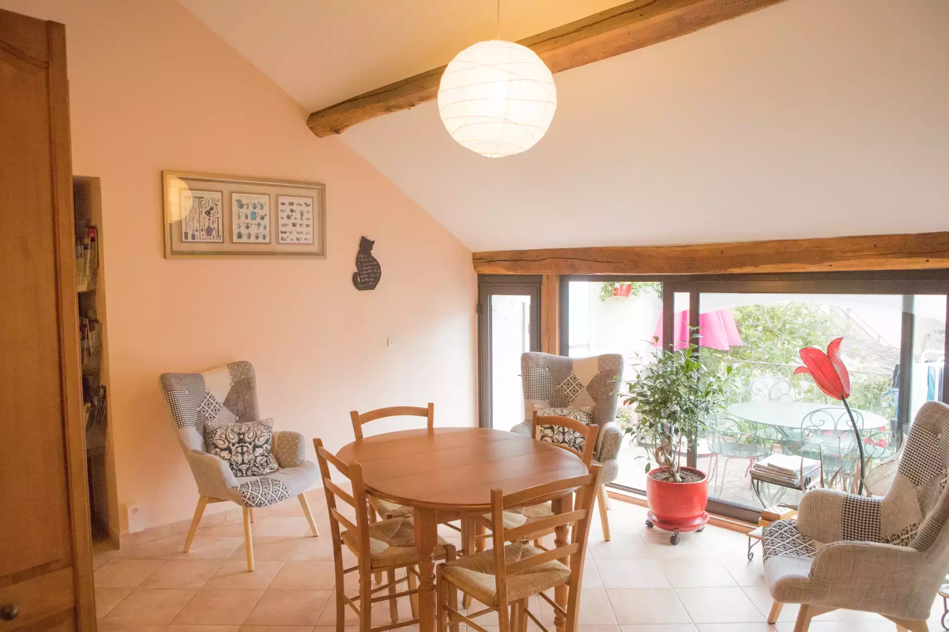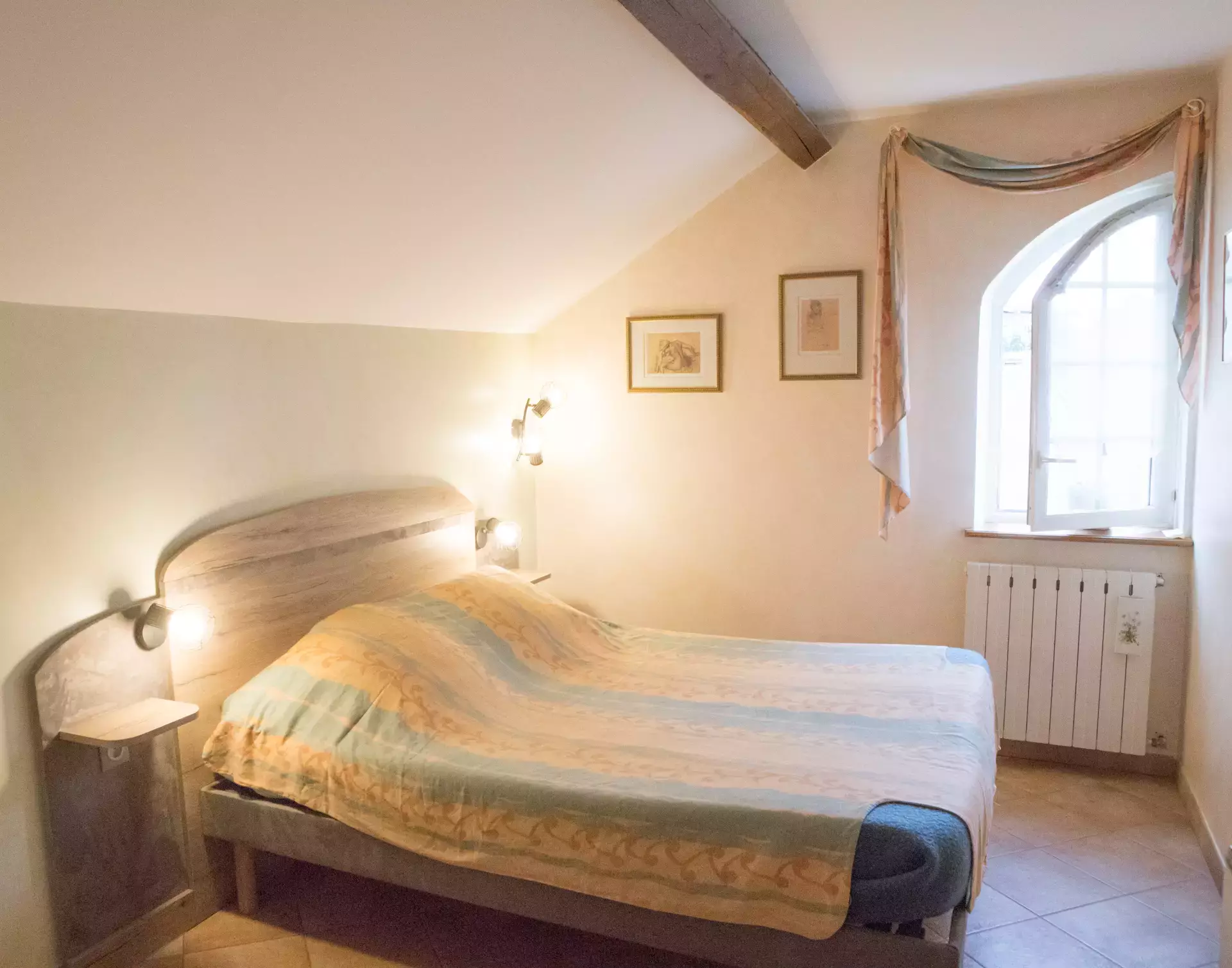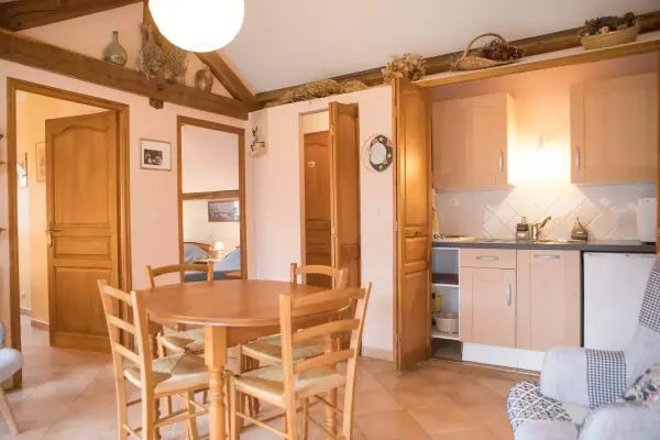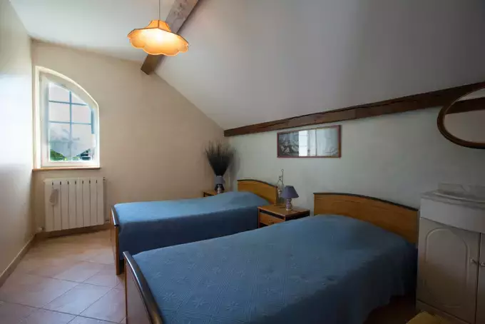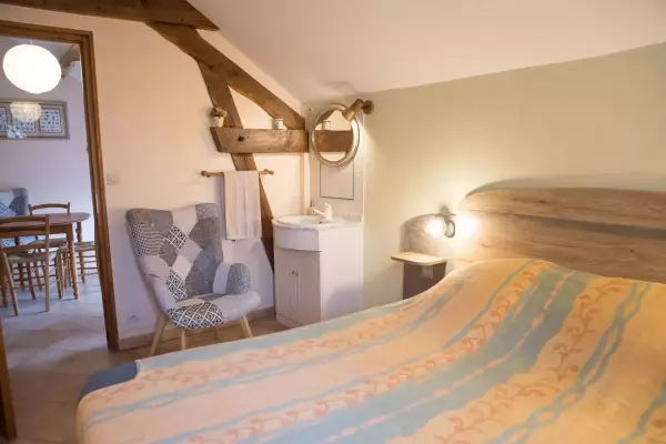 On the 1st floor of a XIXth century village house overlooking the fountain square, a 40 m2 suite with 2 bedrooms (1 bed 160 - 2 beds 90) with shower room, Italian shower and separate toilet, living room with kitchenette at your disposal. Breakfast offered