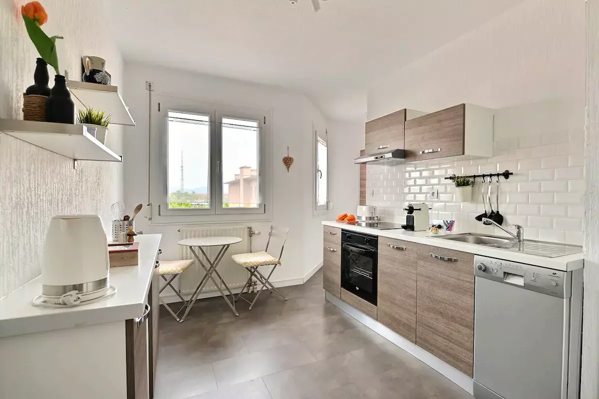 🍽️La Fully equipped kitchen (ceramic hob, oven, microwave, dishwasher, fridge/freezer, Nespresso coffee machine, toaster, kettle, tumble dryer, crockery, kitchen equipment, iron and ironing board),