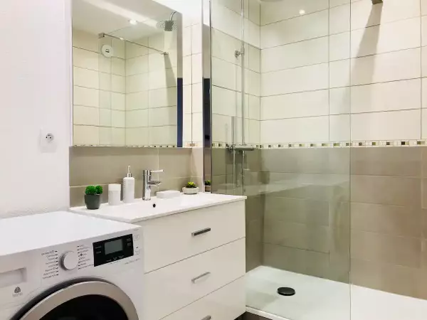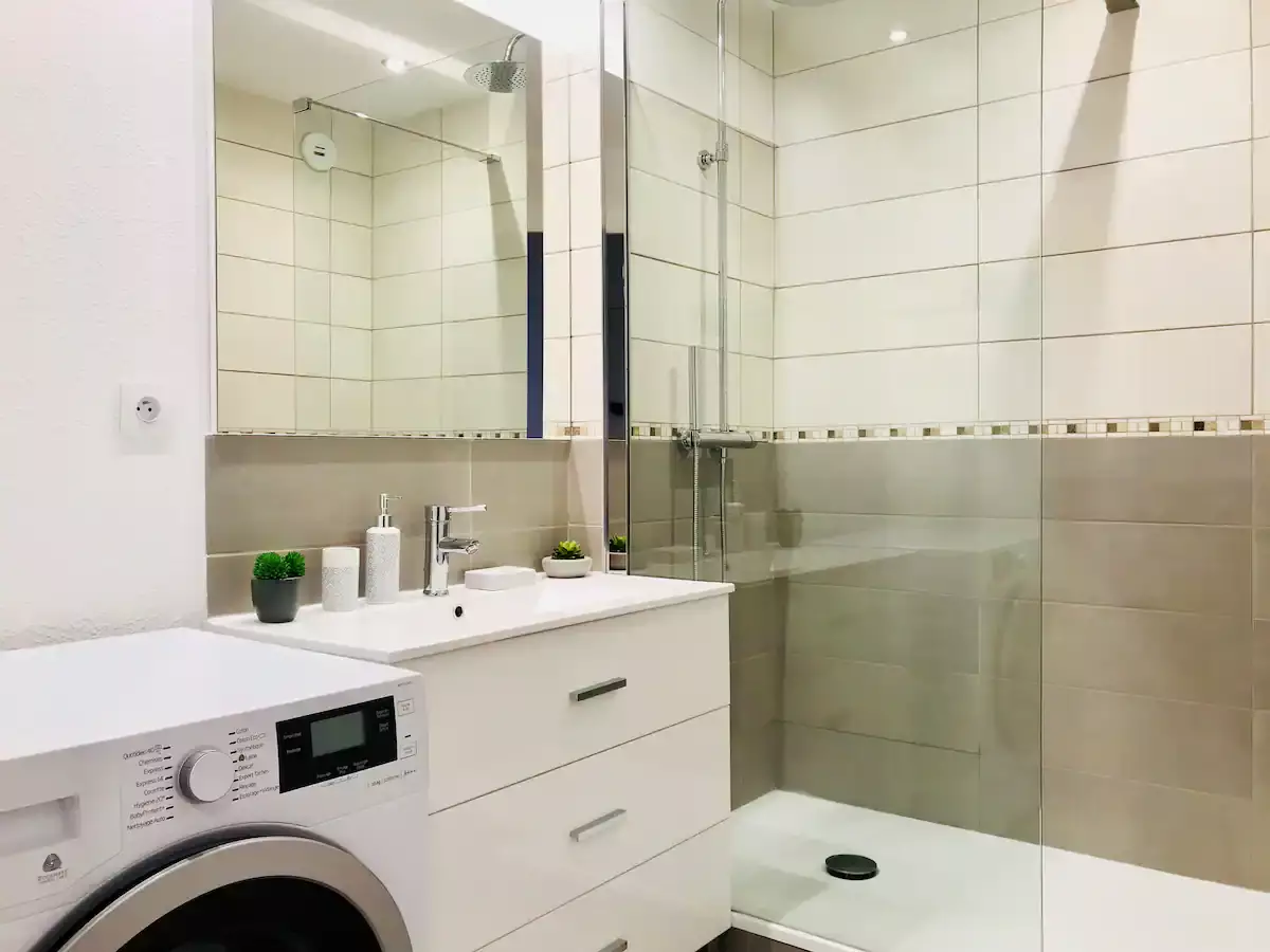 🚿a bathroom with a walk-in shower, a washing machine and a tumble dryer,