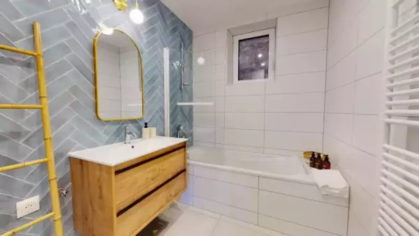 - 🛁 a bathroom with bathtub, washbasin unit and hair dryer,