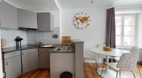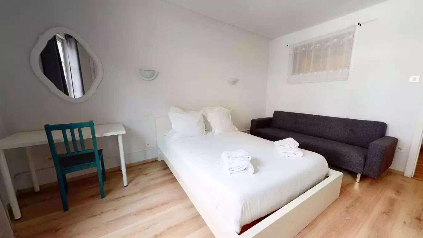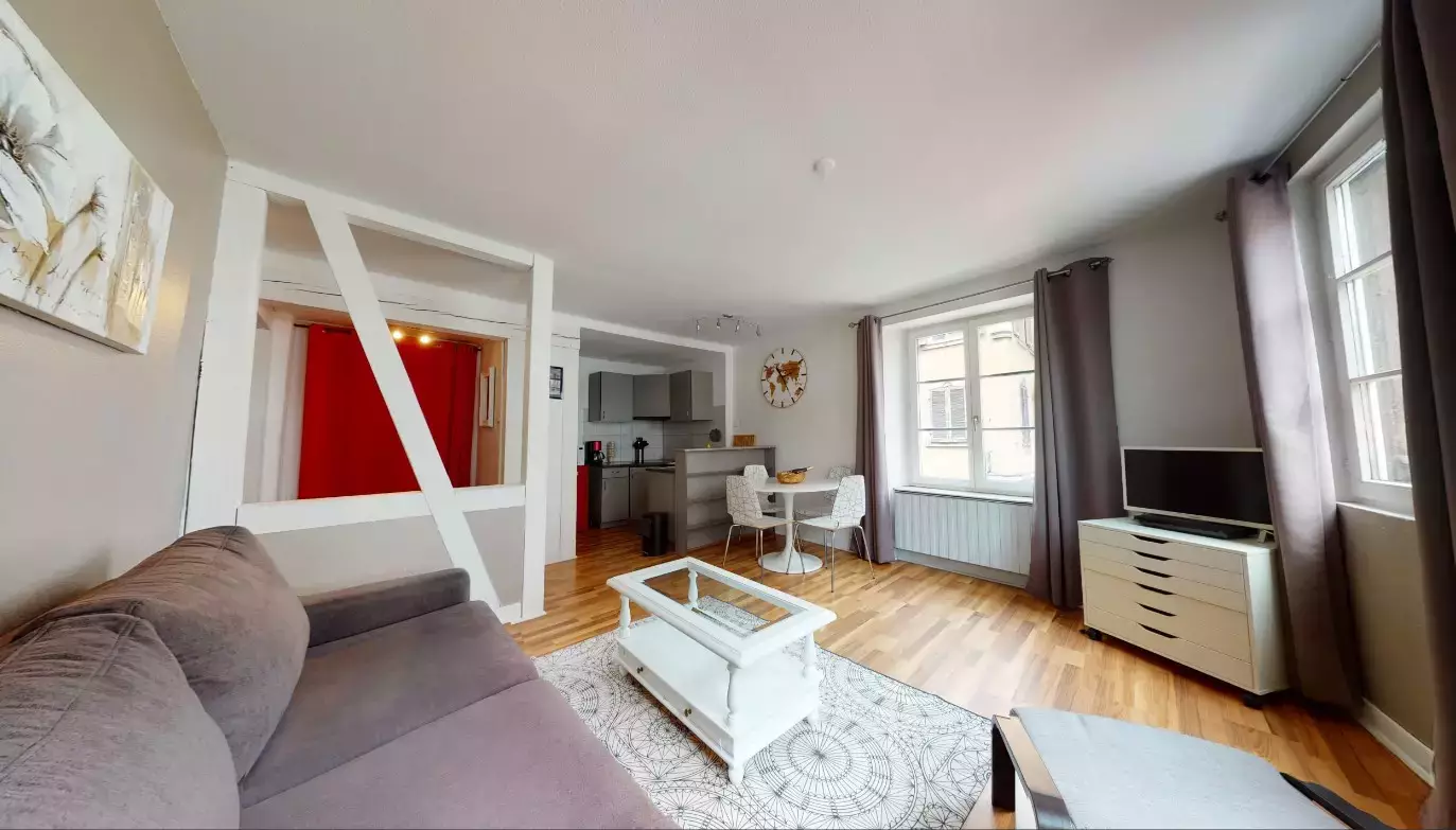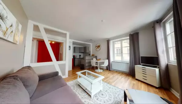 🏠This charming apartment completely renovated, modern and cosy is equipped with a bathroom with shower 🚿, a small kitchen equipped 🍽️ (oven, plates and réfridge), a washing machine, a living area with a sofa bed of 160 cm 🛋️, a flat screen TV, wifi and a spacious bedroom with a double bed of 140 cm 🛏️.