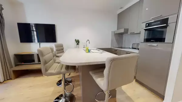 🍽️ 🛏️ a large space including 1 bedroom with non seacute double bed 180x200cm, a storage cabinet and a large TV éflat screen TV, all opening onto a fully equipped open kitchen/dining room (oven/microwave, vitro hob, hood, dishwasher, Nespresso machine, kettle, toaster); Nespresso, kettle, toaster…) including a bar and 4 comfortable stools