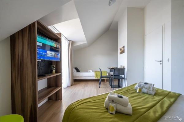 Le Studio Supérieur est un appartement d'environ 20m2 pour 1 à 2 personnes bénéficiant d'un balcon avec une vue dégagée côté rue.