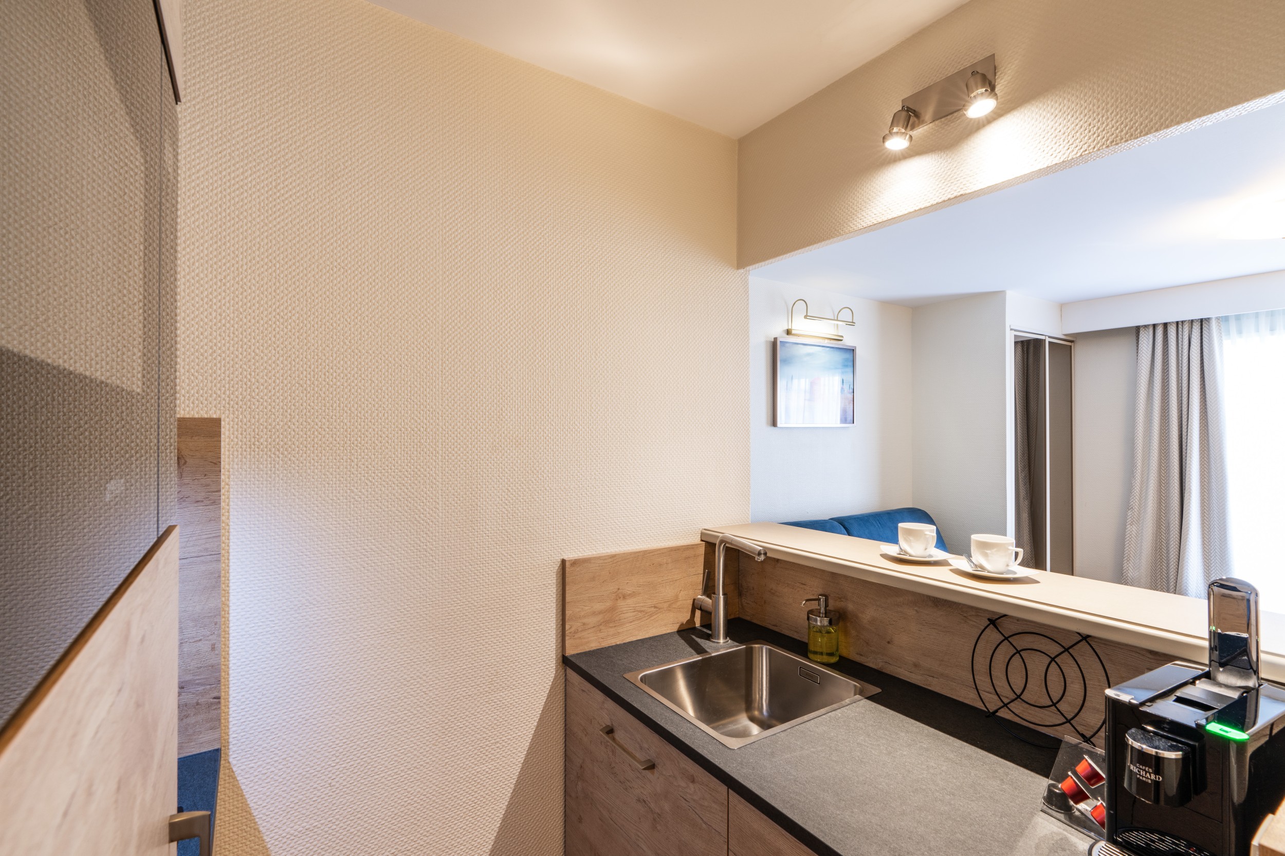 Appartement confort de 1 à 4 personnes, composé d'une chambre avec lit double (ou twin sur demande), d'un coin séjour avec canapé convertible, cuisine équipée et d'un balcon.