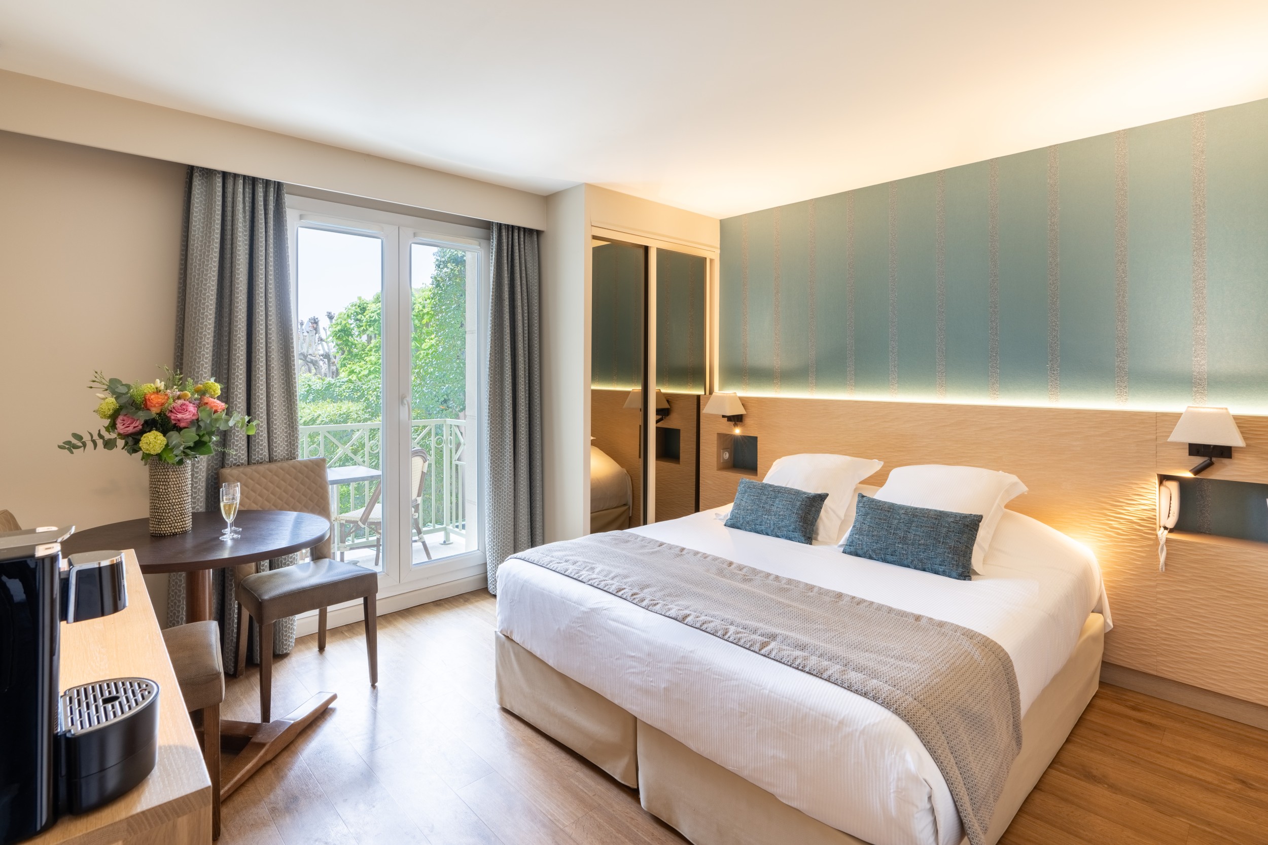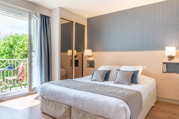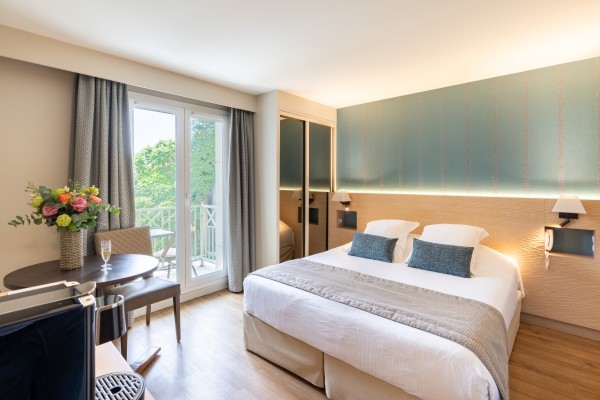 Cette chambre pour 1 ou 2 personnes avec lit double ou twin, balcon, d’une superficie de 20 m², offre confort et douceur de vivre pour vos séjours privés ou professionnels.
