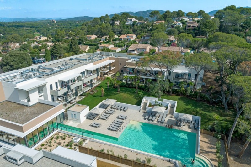 Au rez-de-chaussée se trouve l’accueil, un lobby spacieux avec canapé et tables ainsi qu’un espace détente. Envie d’une boisson rafraîchissante ? Passez commande au bar et sirotez votre boisson, et si le temps le permet, installez-vous sur la terrasse extérieure pour profiter du soleil varois. C’est également là que se trouve les temples du bien-être : le spa avec salles de modelage et sauna ainsi que la piscine privative, parfaits pour se détendre en toute saison.
