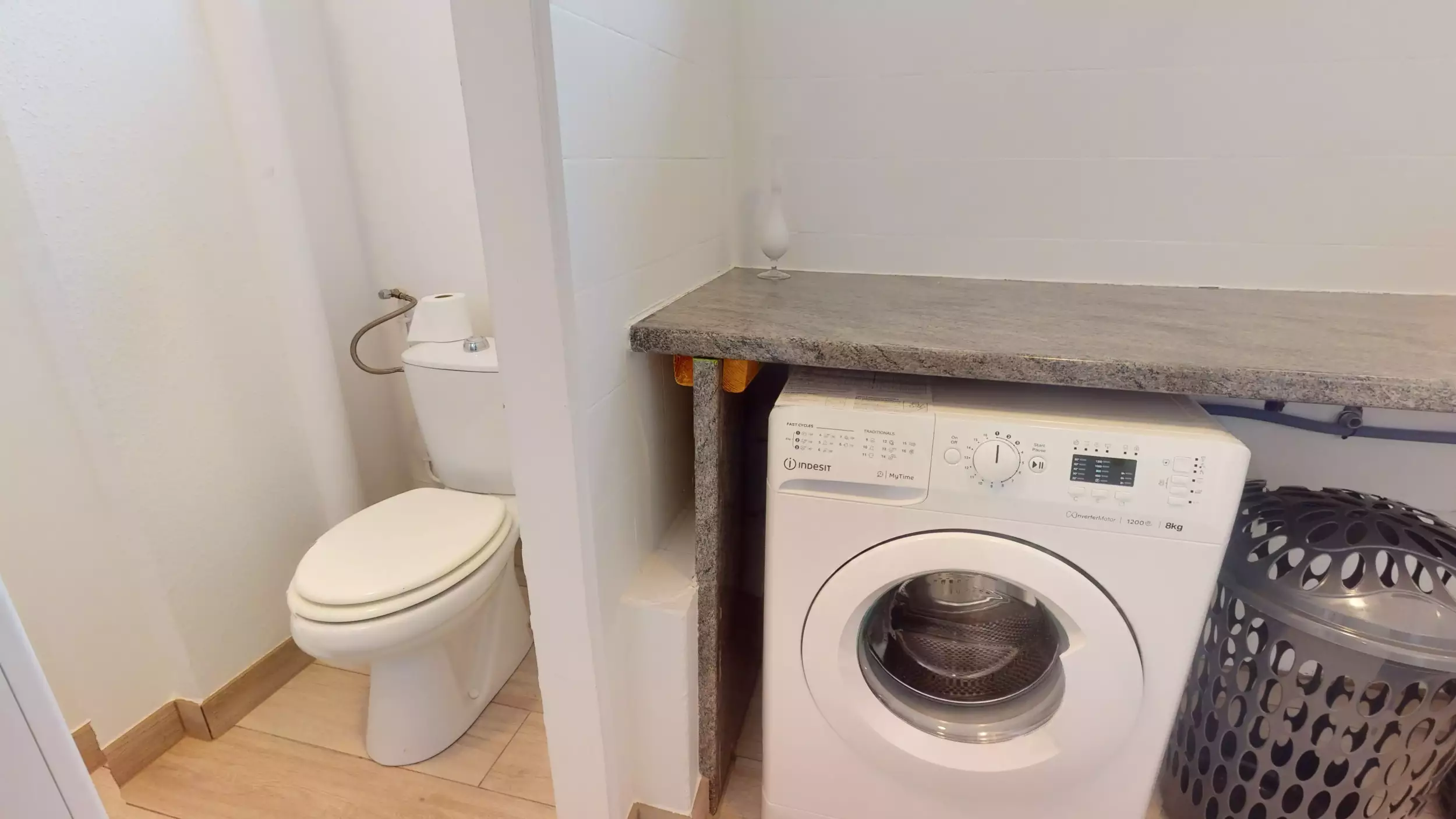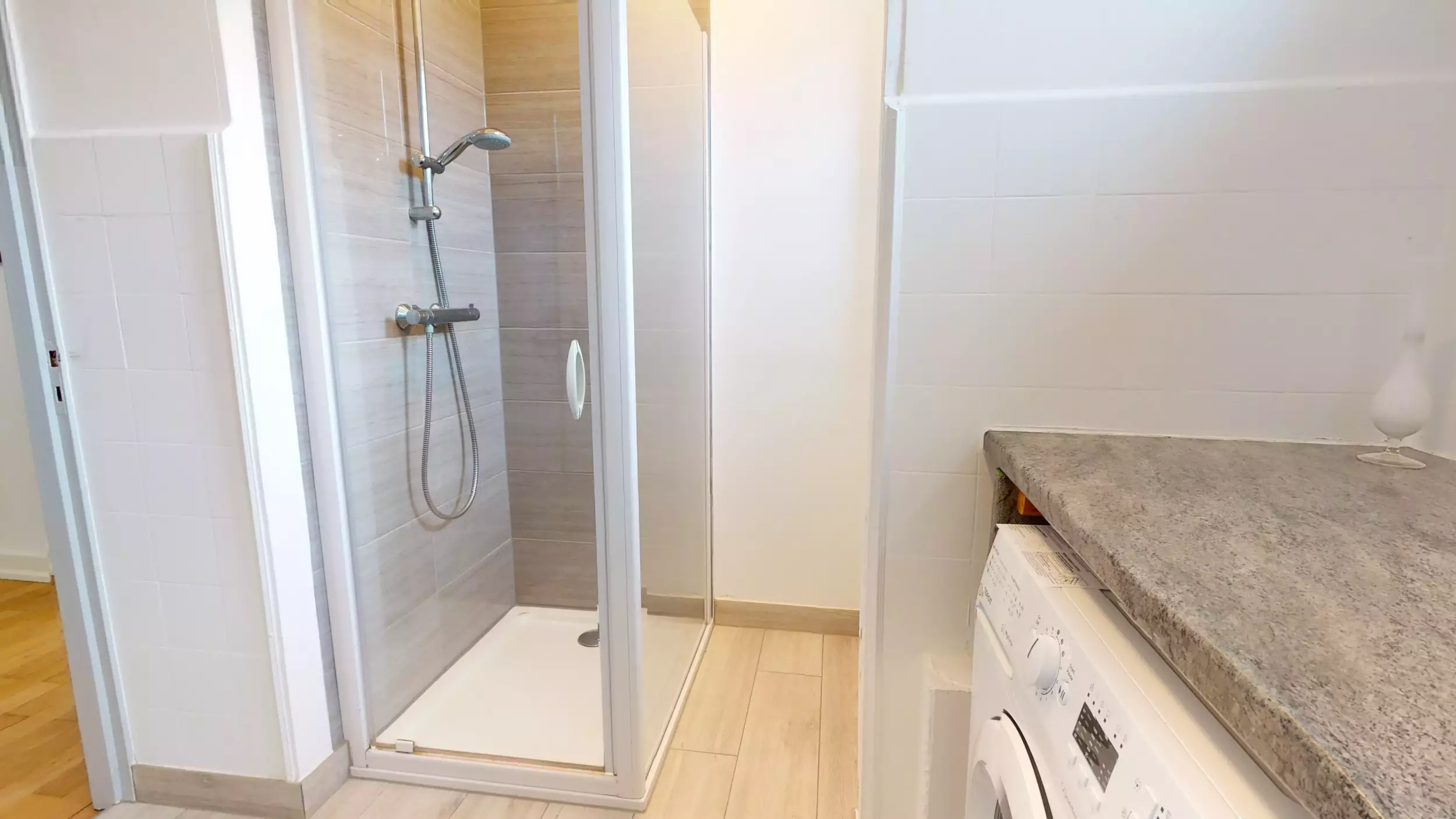 🚿 🚽 une salle de bain avec douche et toilette, ainsi qu’une machine à laver.