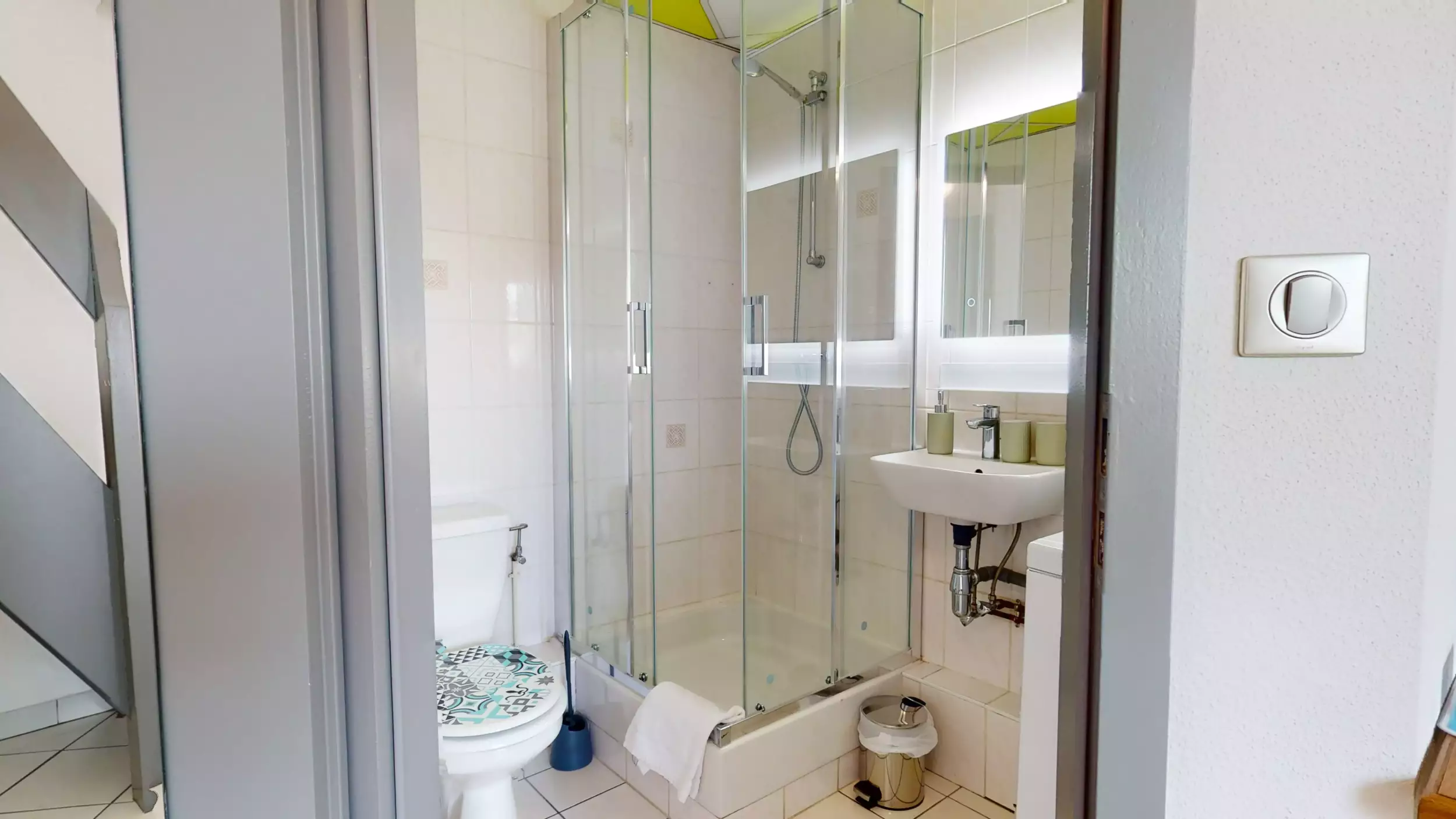 🚿 🚽L’appartement dispose d’une salle de bain avec une douche, un toilette et un lave-linge.