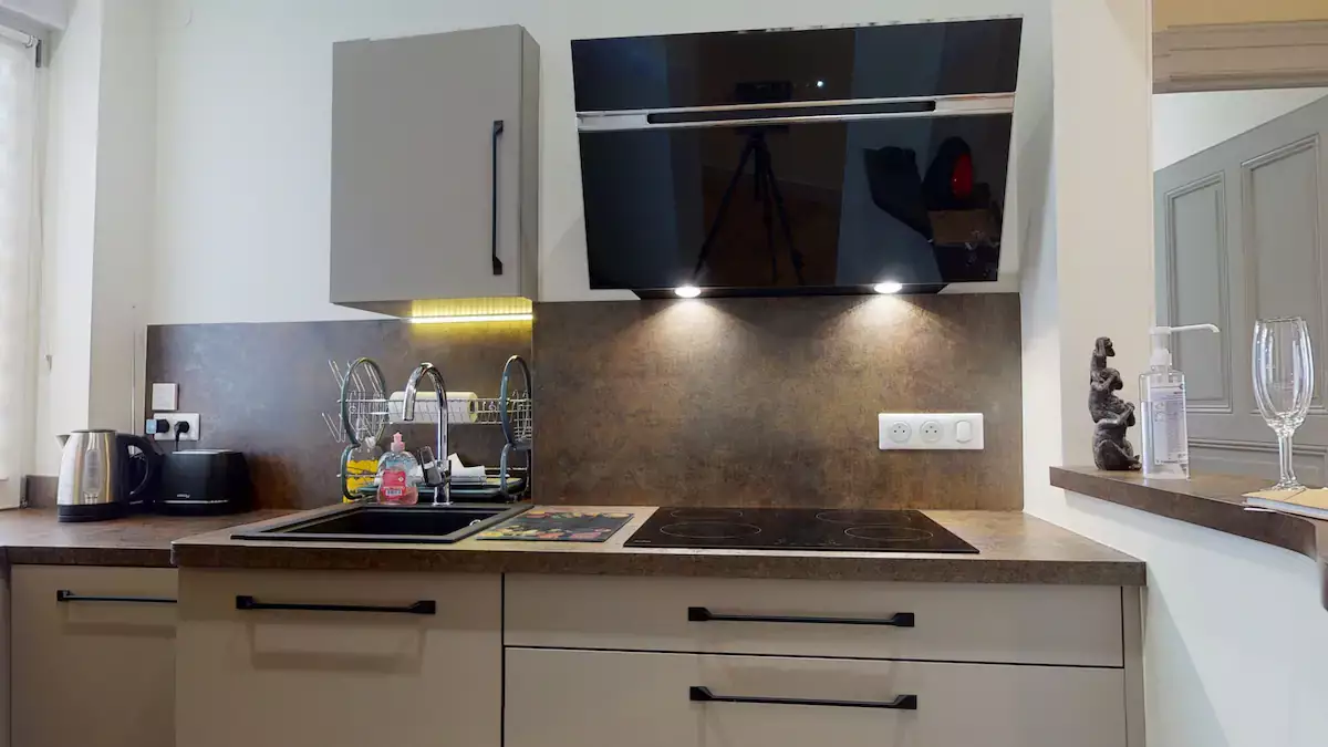 La cuisine est équipée (réfrigérateur-congélateur, four, micro-onde, plaque vitrocéramique, hotte, lave-vaisselle, station radio connectée, cafetière classique, bouilloire, grille-pain, poêles, casseroles, vaisselles et ustensiles de cuisine).