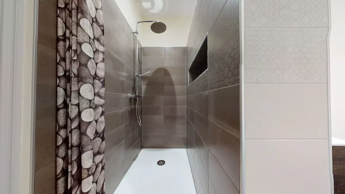 Une salle de bain avec douche, double vasque et machine à laver ainsi qu’un toilette séparé complète ce bien.