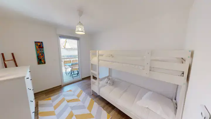 🛏️ Coté nuit, l'appartement dispose d'une chambre avec un lit Queen size et une chambre avec un lit superposé 🪜. (⚠️Cet appartement est équipé d’un lit superposé. Le couchage en hauteur ne convient pas aux enfants de moins de 6ans.)
