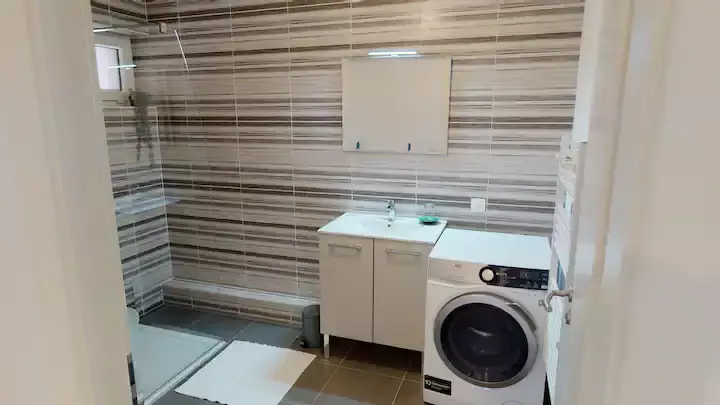 🚿 Dans la salle de bain, il y a une douche et une machine à laver le linge séchant.