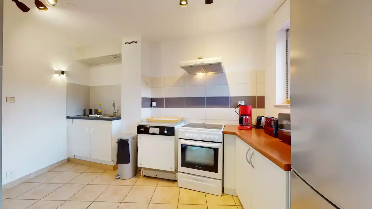 🛗 Situé au 2ème étage avec ascenseur d’une résidence calme, cet appartement de 94 m² dispose d'une cuisine 🍽️ lumineuse entièrement équipée (réfrigérateur/congélateur, plaque de cuisson, four, micro-onde, grille-pain, bouilloire, cafetière filtre) ouvert sur un espace repas et un accès sur un balcon.
