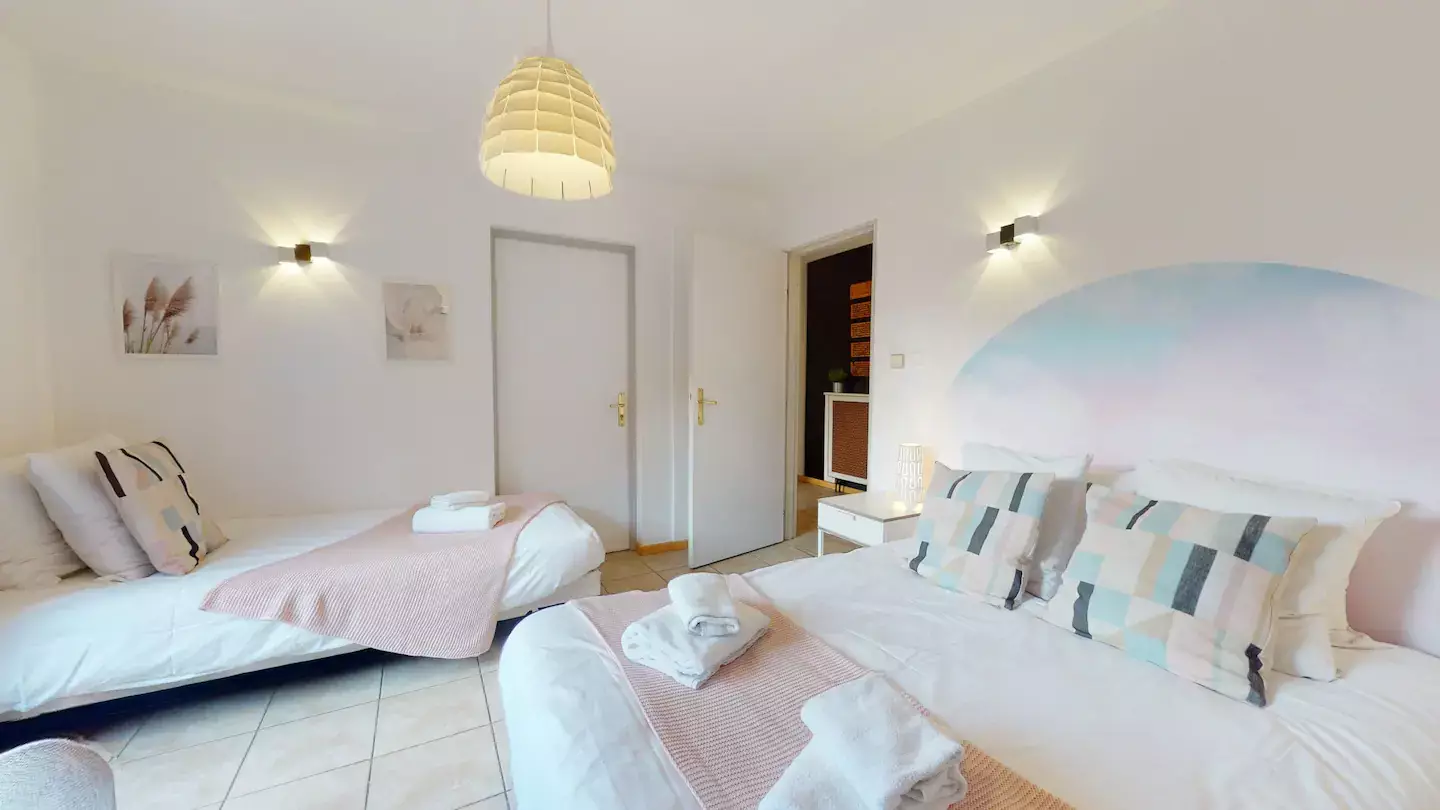 🛏️ La seconde chambre dispose d’un lit double et d’un lit simple ainsi qu’un accès à une salle d’eau avec 🚿 douche, toilette 🚽 et lave-mains 🧼.