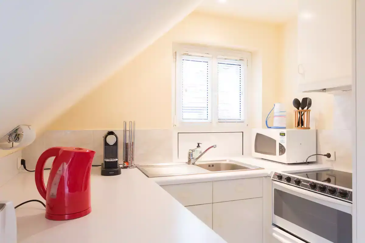 Le logement est fonctionnel et tout équipé : vaisselle, four, four micro-ondes, machine à café Nespresso, 4 plaques vitro céramiques, hotte, lave-vaisselle, sèche-cheveux, lave-linge, aspirateur,