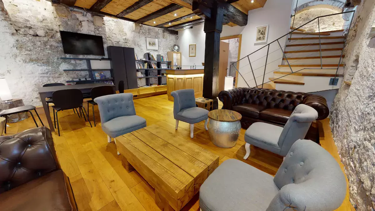 🛋️ Nous mettons gratuitement à votre disposition un espace Lounge au sous-sol du bâtiment, commun aux 4 logements de la maison, il comprend une pièce de vie avec canapés, fauteuils, une table avec des chaises, un bar avec bouilloire, cafetière Nespresso, une TV à écran plat, des livres et jeux de société.
