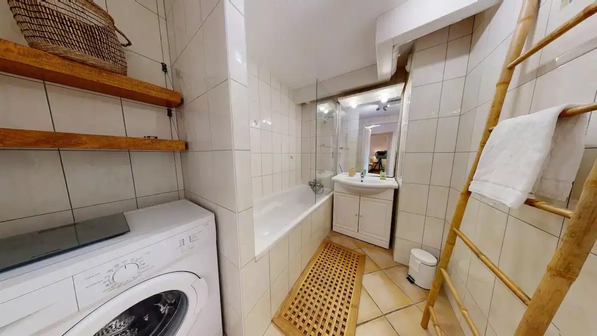 🚿 Une salle de bain avec baignoire et lave-linge ainsi 🚽 qu’une toilette séparée.