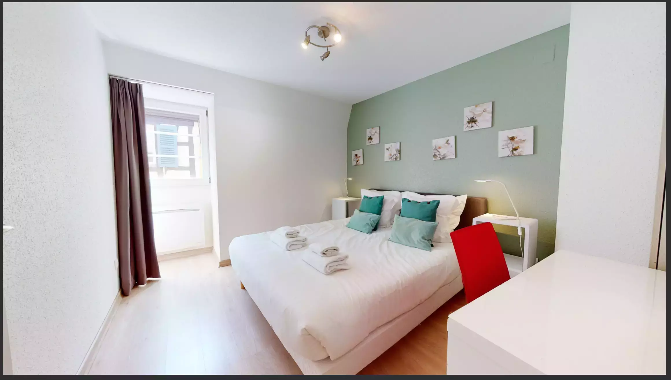 🛏️ 🚿d’une chambre avec un lit double, avec sa salle de douche privée,