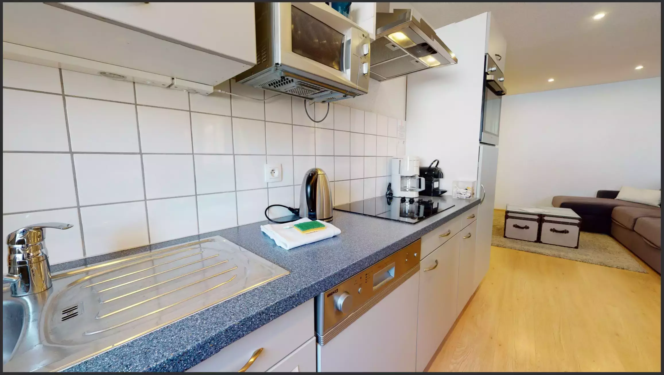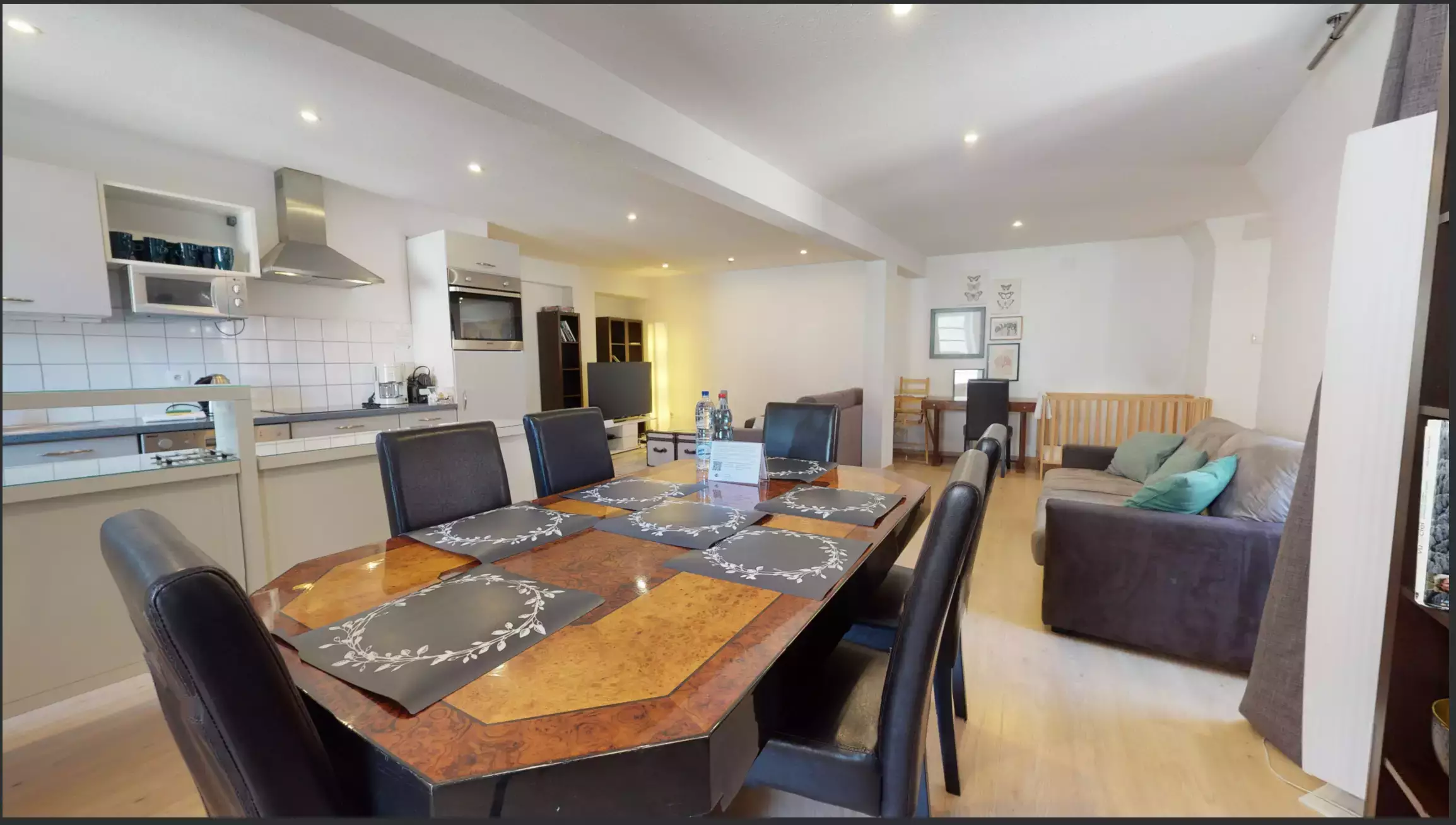 🍽️ une cuisine ouverte équipée (réfrigérateur/congélateur, plaque de cuisson, four, lave-vaisselle, micro-onde, cafetière filtre et Nespresso, bouilloire, grille-pain),